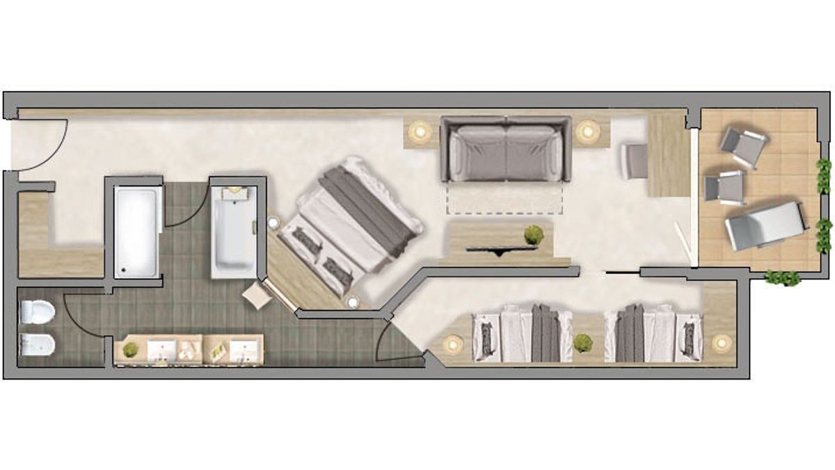 für 2–6 Personen, ca. 75 m² (inkl. Loggia), großes Doppelzimmer mit Luxusbetten von VI-Spring und Wohnecke mit ausziehbarer Couch, separatem Kinderzimmer mit 2 Einzelbetten und teilweise mit Fenster, begehbarem Kleiderschrank und Süd loggia. Tiefgarage im Guesthouse V inklusive.