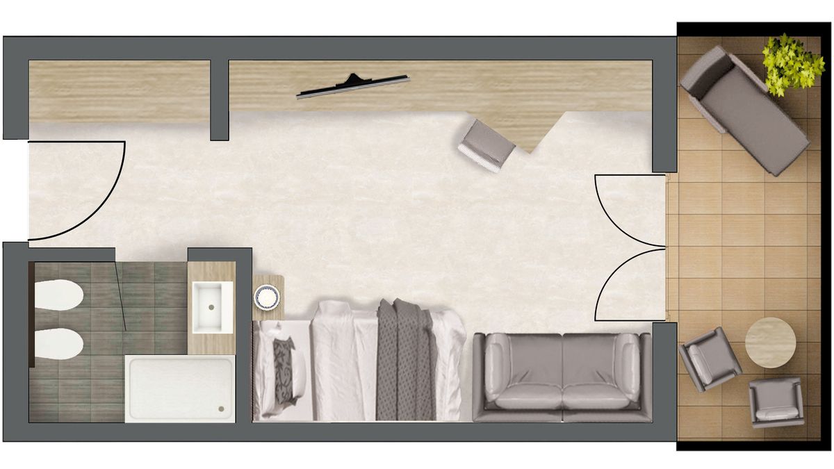 für 1 Person, ca. 18 m², Einzelzimmer mit komfortablem, großem Bett (1,20 x 2 m), Lesesessel, Holzboden und Balkon. Tiefgarage unter den Tennisplätzen inklusive.